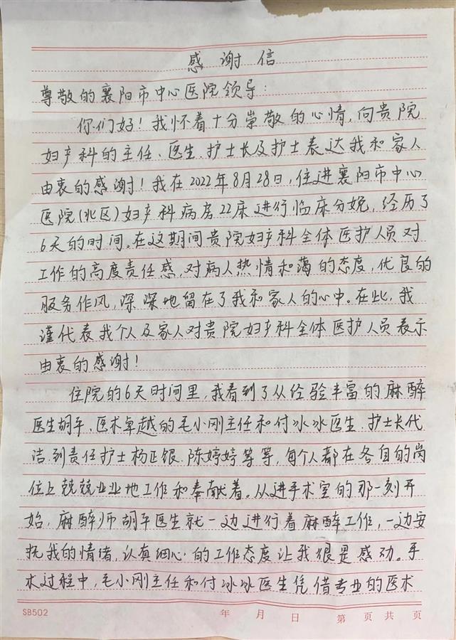 记者了解到,8月份,该科室收到了4封感谢信。妇产科副主任毛小刚说,这些纸短情长的感谢信,是对科室医疗技术的认可,也是对优质护理服务的肯定,更是激励大家前进的动力。