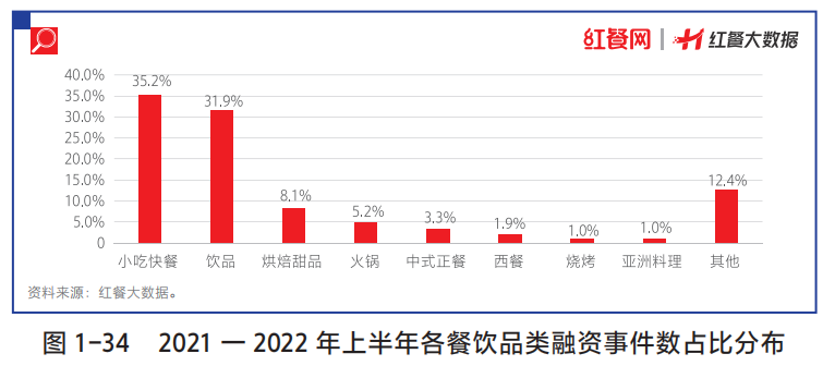 从融资餐企所属的细分品类来看,2021年到2022年上半年,小吃快餐和饮品两个品类最受资本关注,融资事件数占比分别是35.2%、31.9%;烘焙甜品崭露头角,融资事件数占比为8.1%;火锅、中式正餐和西餐则位于第三梯队,融资事件数占比分别是5.2%、3.3%和1.9%。