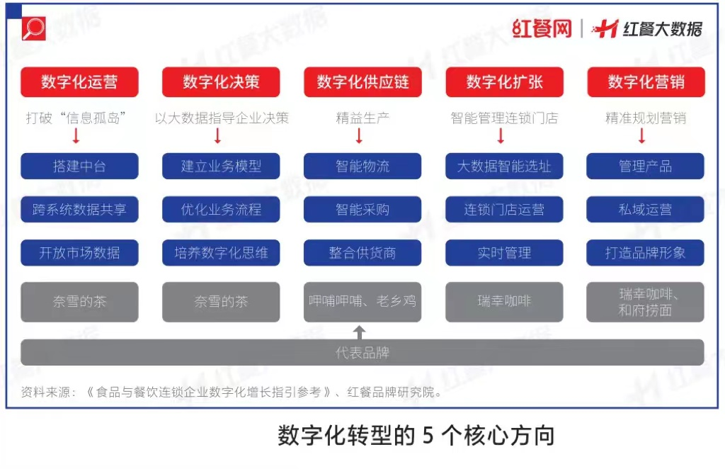 餐饮品牌要进行升级,需要各项运营策略的配合,譬如数字化运营就是目前颇受关注的议题。总体来看,在餐饮领域,餐企进行数字化转型主要有5个重要的方向,包括数字化运营、数字化决策、数字化供应链、数字化扩张和数字化营销。