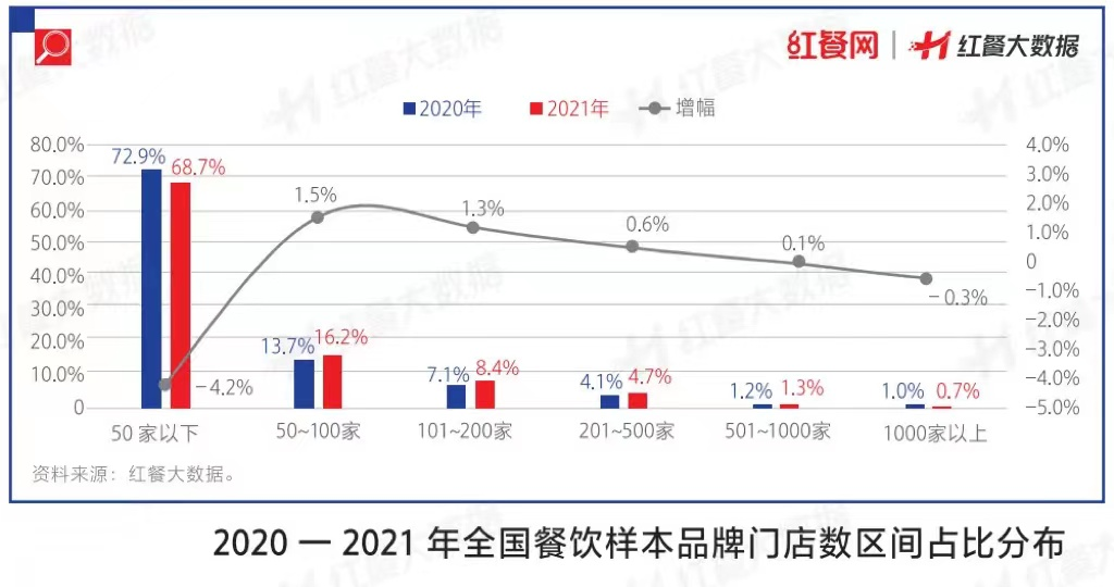 在餐饮市场的持续洗牌下,餐企的连锁化进程在逐渐加快。红餐大数据显示,2021年餐饮品牌平均门店数量整体有上升趋势。一方面可能是由于部分品牌本身的品牌力不强而被淘汰出局,另一方面或是由于部分品牌逆势扩张,实现了门店数量的进一步增长。