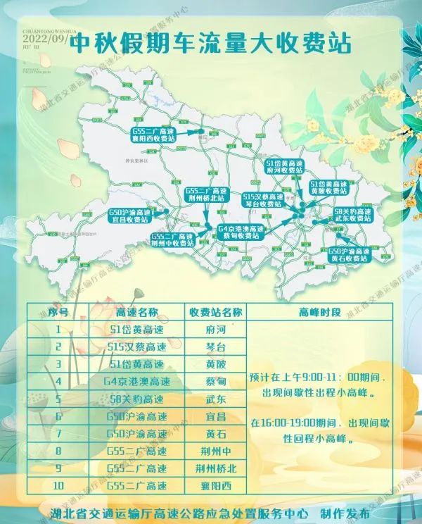 中秋假期将至,9月7日,湖北省交通运输厅高速公路管理局应急处置服务中心发布《2022年“中秋”假期湖北省高速公路出行服务指南》,为广大司乘朋友出行提供参考。