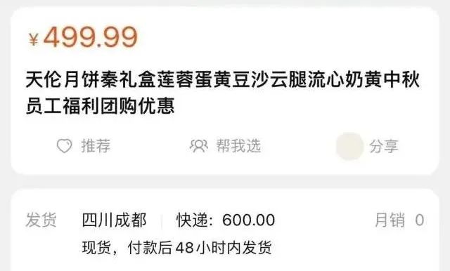 于是,市面上出现了不少499.99元的月饼礼盒,还有电商店铺将月饼运费设为600元。