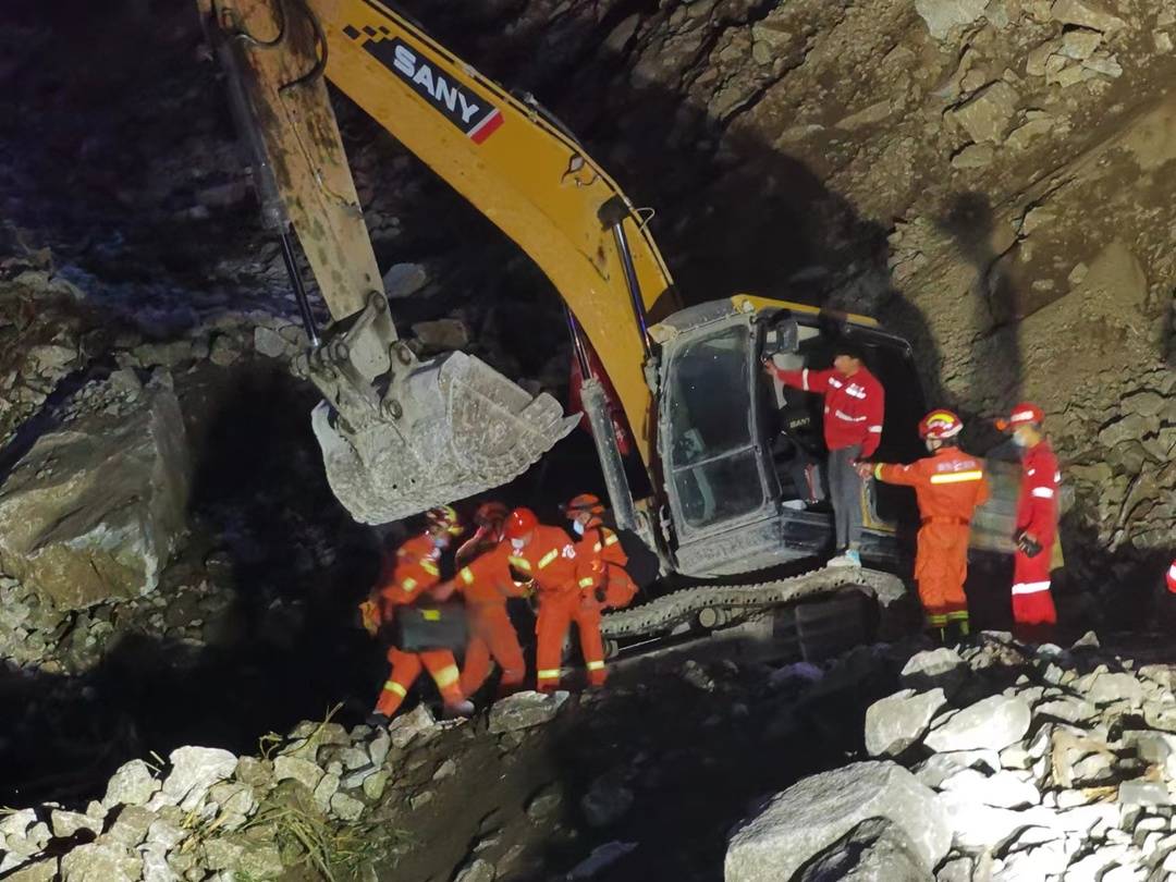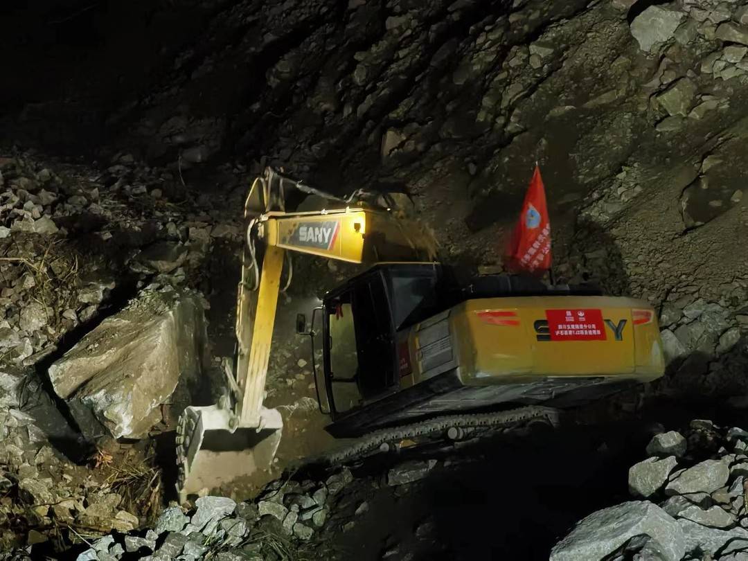 目前,消防员正在利用大型机械设备开辟援救通道,待通道开通后,将第一时间进行人员抢救。