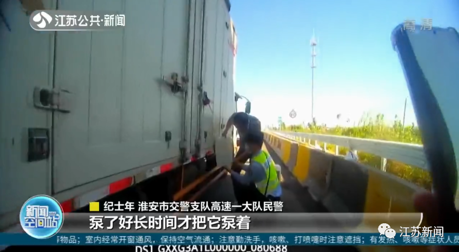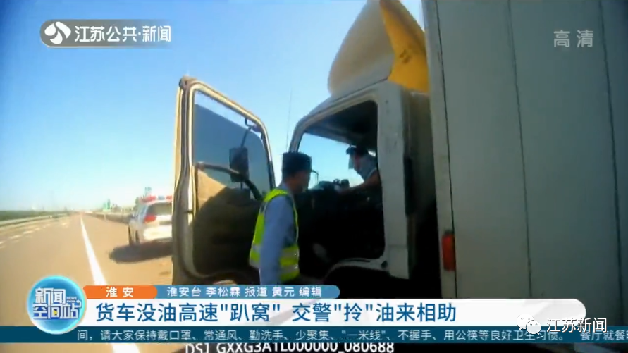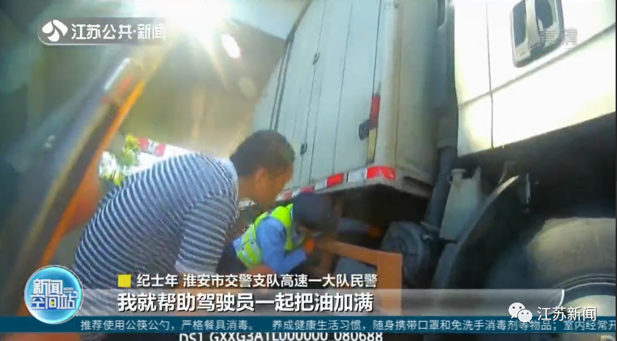 “我就帮助驾驶员一起把油加满,加满以后,因为油缺得比较多,要用油泵去泵,泵了好长时间才把它泵着。”淮安市交警支队高速一大队民警纪士年说。
