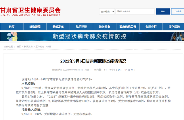 2022年9月6日甘肃新冠肺炎疫情情况