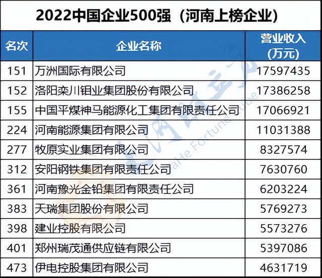 6日,中国企业联合会发布了“2022中国企业500强”榜单。榜单显示,2022中国企业500强营业收入实现较高速度增长,营业收入总额达到102.48万亿元,首次突破百万亿元大关。其中,我省共有11家企业入榜,分别是万洲国际(151位)、洛阳钼业(152位)、中国平煤神马集团(155位)、河南能源集团(224位)、牧原集团(277位)、安钢集团(312位)、豫光金铅集团(361位)、天瑞集团(383位)、建业控股(398位)、郑州瑞茂通(401)、伊电控股集团(473)。(大河财立方)