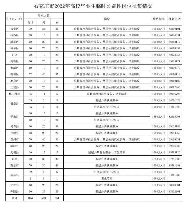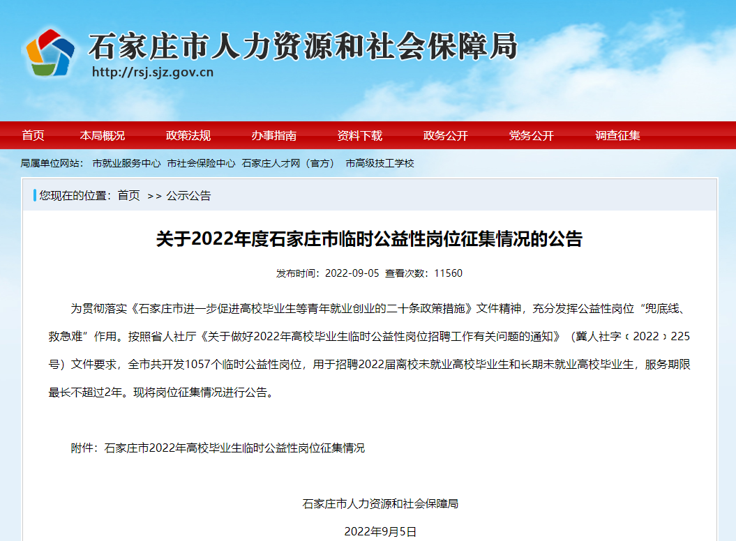 为贯彻落实《石家庄市进一步促进高校毕业生等青年就业创业的二十条政策措施》文件精神,充分发挥公益性岗位“兜底线、救急难”作用,石家庄全市共开发1057个临时公益性岗位,用于招聘2022届离校未就业高校毕业生和长期未就业高校毕业生。据了解,这些临时公益性岗位主要涉及基层公共就业服务、公共管理和社会服务、卫生防疫等方面,服务期最长不超过2年。