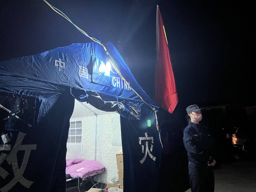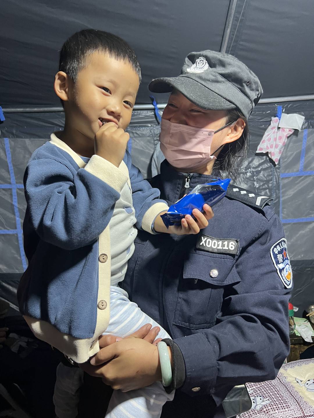 姚杰深知身上这身警服的责任,她不停奔走在一顶顶帐篷间,安抚劝导群众、体温监测、应急避险知识宣传、矛盾纠纷排查化解、协调领取生活物资……每天连续工作近20小时,睡眠不足导致双腿有些浮肿。