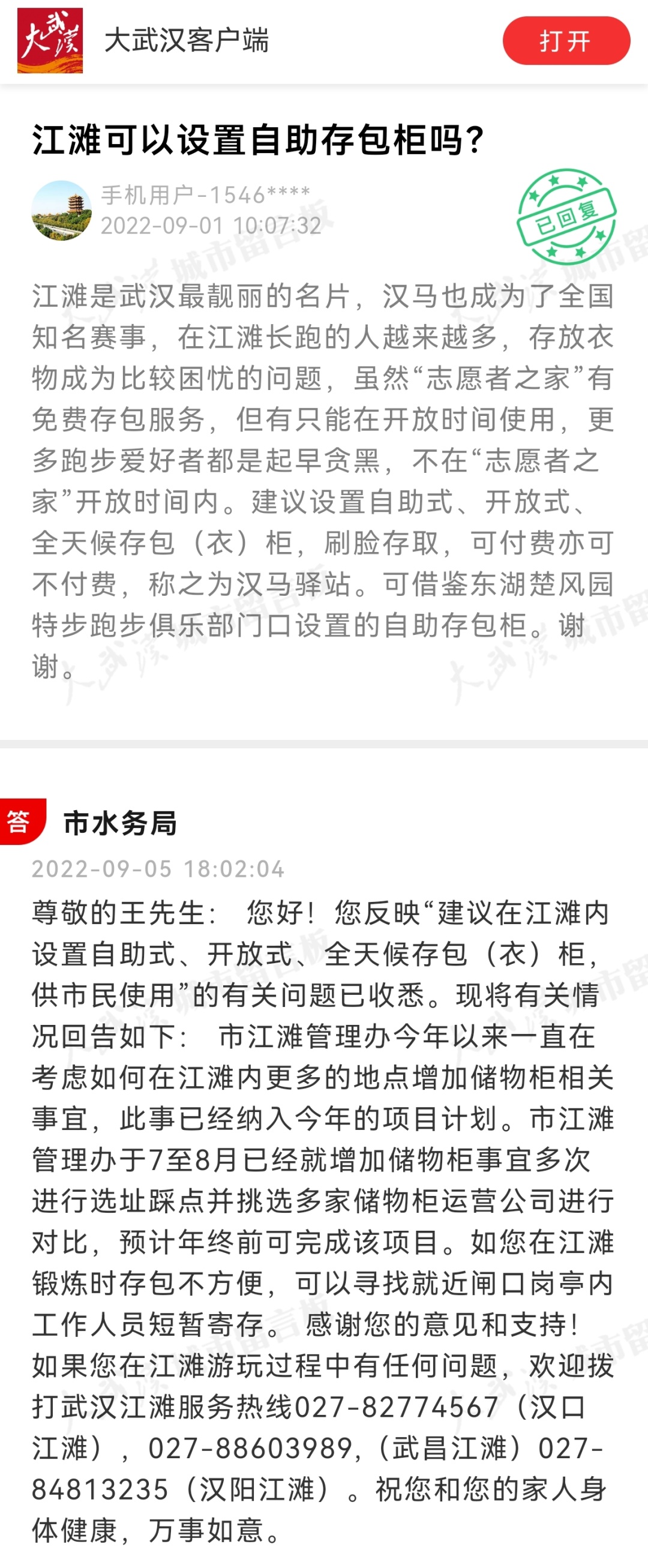 近日,有网友在武汉城市留言板上建议武汉江滩设立临时存物柜,对于网友的建议,市水务局回复称: