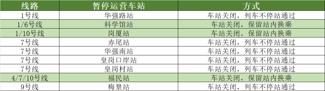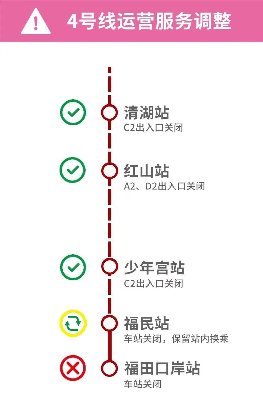 1. 牛湖至会展中心区段各站(含牛湖站、会展中心站)维持正常运营服务。2. 福田口岸站停止运营服务,具体恢复时间待另行通知。3. 福民站车站关闭,列车站内停车可换乘7/10号线。4. 少年宫站C2出入口,红山站A2、D2出入口以及清湖站C2出入口暂时关闭。