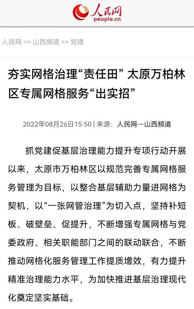 抓党建促基层治理能力提升专项行动开展以来,太原市万柏林区以规范完善专属网格服务管理为目标,以整合基层辅助力量进网格为契机,以“一张网管治理”为切入点,坚持补短板、破壁垒、促提升,不断增强专属网格与党委政府、相关职能部门之间的联动联合,不断推动网格化服务管理工作提质增效,有力提升精准治理能力水平,为加快推进基层治理现代化奠定坚实基础。