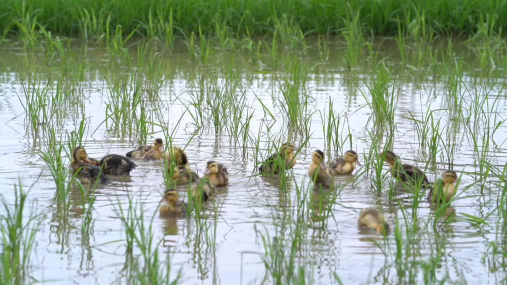 发放之后的鸭苗,被陆续放进梯田,与青葱拔节的秧苗,圈养生长。