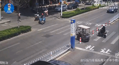 将正在横过道路的电动车和电动三轮车同时撞翻