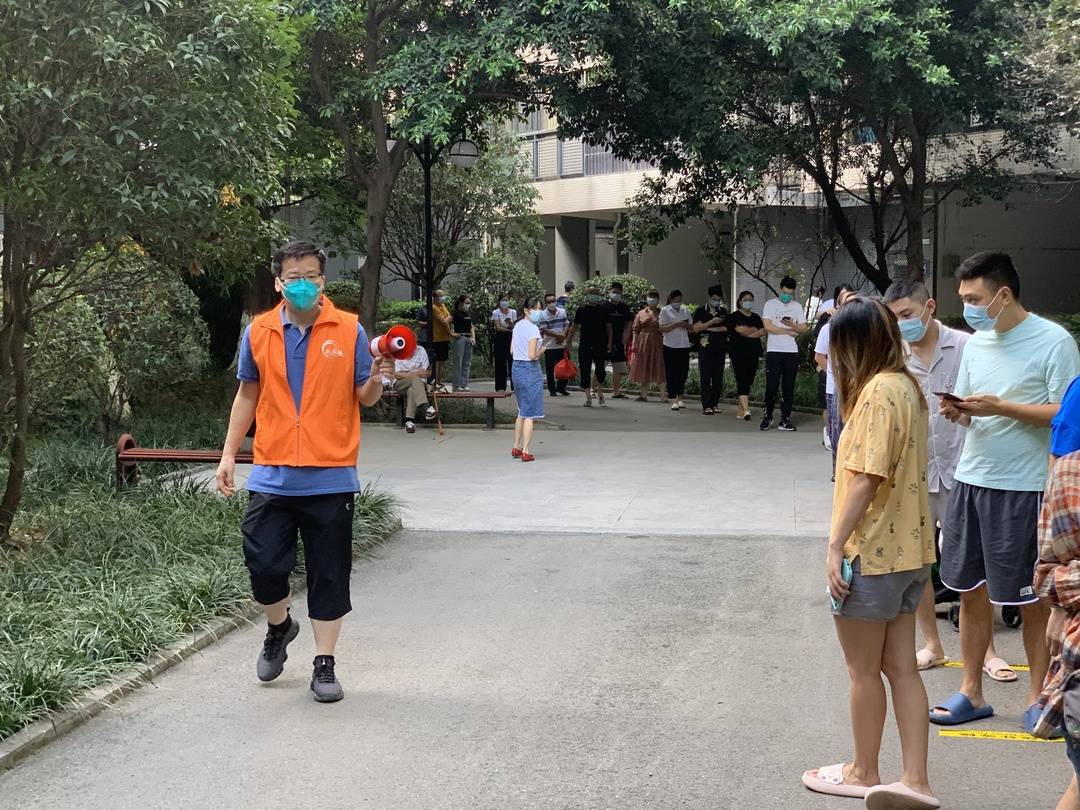9月6日是我到岗的第一天,上午7点,社区8名志愿者就到了小区门口忙着准备核酸检测要用的桌椅、酒精、棉签等物资,派给我的任务是维持秩序,以及提醒邻居及时下楼、戴口罩、保持一米间距、不要在小区逗留等。