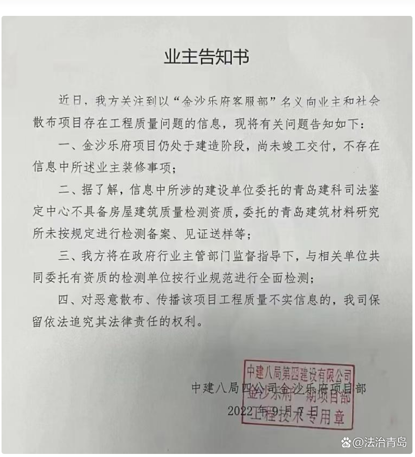 9月6日晚间,青岛金沙乐府项目以客服部名义发布《致金沙乐府全体业主的告知函》,称该项目“由中建八局四公司总承包建设的A区楼座部分检测的混凝土强度评定值不符合设计要求”,在业内掀起剧烈波澜。