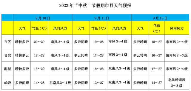 各地最高气温在27~29℃之间,偏南风2~4 级,其中10日夜间和11日夜间我市天空云系较多,云量预计为6~9成,对赏月有一定不利影响。12日早晨,台安和岫岩局部有大雾或浓雾天气,需防范对交通的不利影响。总体来说,中秋假期天气较好,有利于出行和游玩。