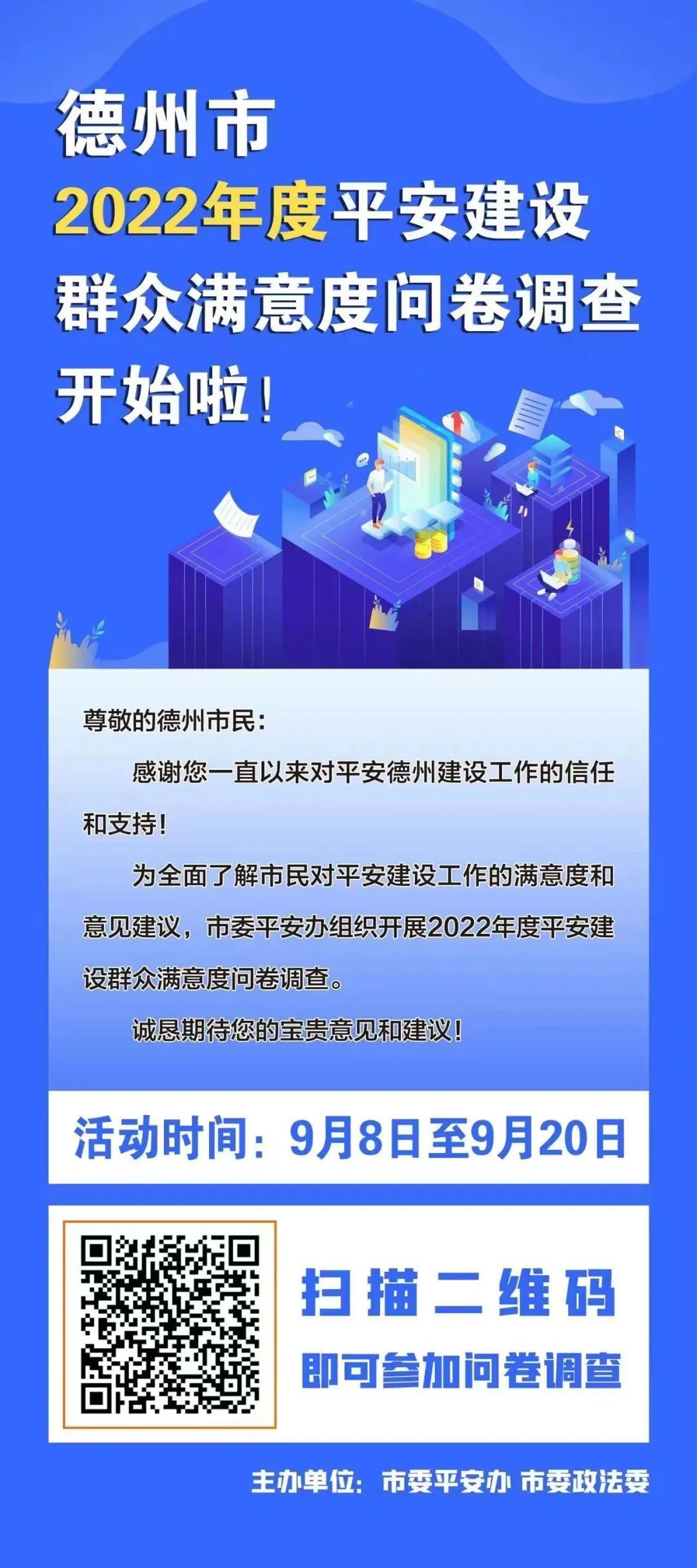 根据中央和省委、市委安排部署,为推进更高水平平安德州建设,广泛听取广大人民群众的意见建议,全面了解掌握全市市民对平安德州建设工作的满意度,从9月8日至9月20日,市委平安办在全市范围内组织开展2022年度平安建设群众满意度问卷调查。
