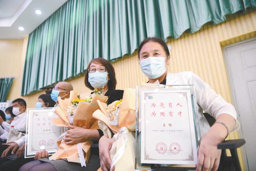 丰台区教育系统举行了第38个教师节庆祝大会,会上为“光荣从教30年”的教师代表颁发了证书。 和冠欣 摄