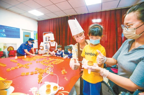 顺义区胜利街道红杉一品社区的小朋友们制作月饼,赠送给老师和社区退休教师。武亦彬 摄