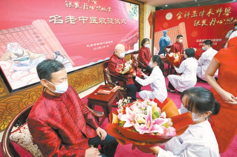 北京市鼓楼中医医院举办“金科玉律承师恩,银发丹心照岐黄”教师节主题庆祝活动暨名老中医收徒、名医名家工作室揭牌。方非 摄
