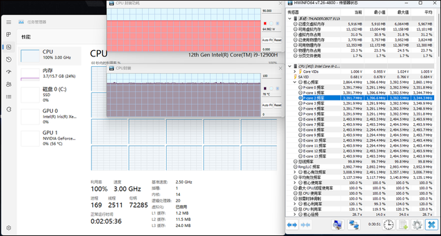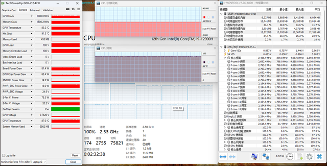 室温25℃左右,利用Aida64和FurMark对911X猎荒者进行双考测试(狂暴模式),半小时之后的情况如下所示:i9 12900H处理器的封装功耗约为45W,大核频率约2.8GHz,小核频率约2.2GHz,温度则在86℃左右;RTX 3050Ti的功耗为80W,温度为83.2℃。满载时的总功耗是45W+80W,完全压住了i9 12900H+RTX 3050Ti,温度也不高,散热很不错。