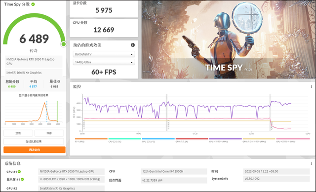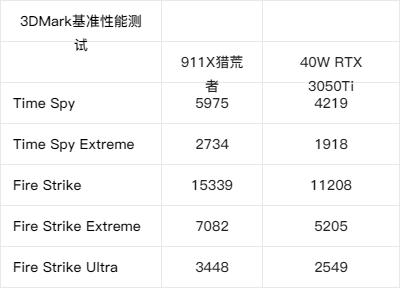在3DMark基准测试中,我们引入了轻便本搭载的40W功耗的RTX 3050Ti作为参考对象。可以看到,由于911X猎荒者的95W RTX 3050Ti功耗高得多,所以性能也领先了一大截,在Time Spy场景中,911X猎荒者独显跑分为5975,领先40W的款RTX 3050Ti约41%,幅度相当大!此外,6000左右的跑分,基本达到了上一代甜品级独显RTX 2060的水平。