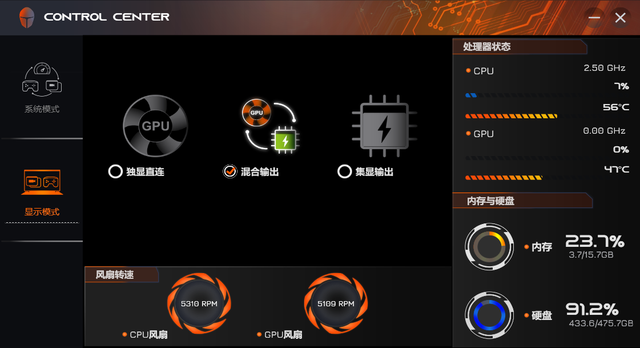 911X猎荒者定位电竞游戏本,主要面向玩网络游戏、电竞游戏的大学生群体。该机搭载的是95W满功耗RTX 3050Ti独显,屏幕支持独显直连,在内置的性能调节软件中即可设置,确认之后机器会重启,即完成了输出模式的切换。另外该机的性能模式切换也做得清晰而简单,易用性很棒。