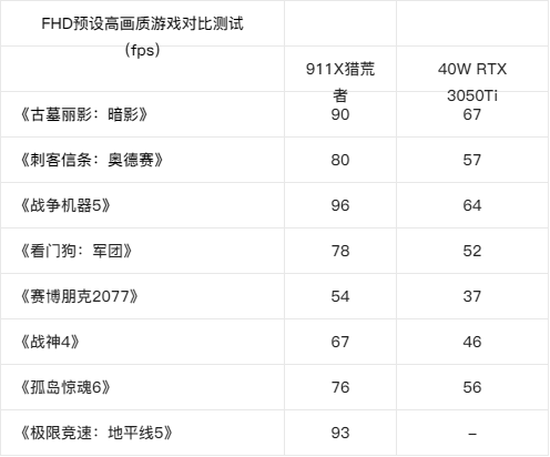 总的来说,就游戏而言,911X猎荒者在FHD分辨率下,应对电竞游戏最高画质非常轻松,搭配144Hz屏能得到相当顺滑的电竞游戏体验。而对于3A游戏,预设高画质没有压力。