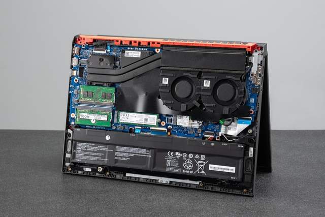 该机拆机简单,不过需注意有一颗隐藏螺丝。内部设计规整,采用双风扇双热管散热,预留了一个M.2 SSD硬盘位。