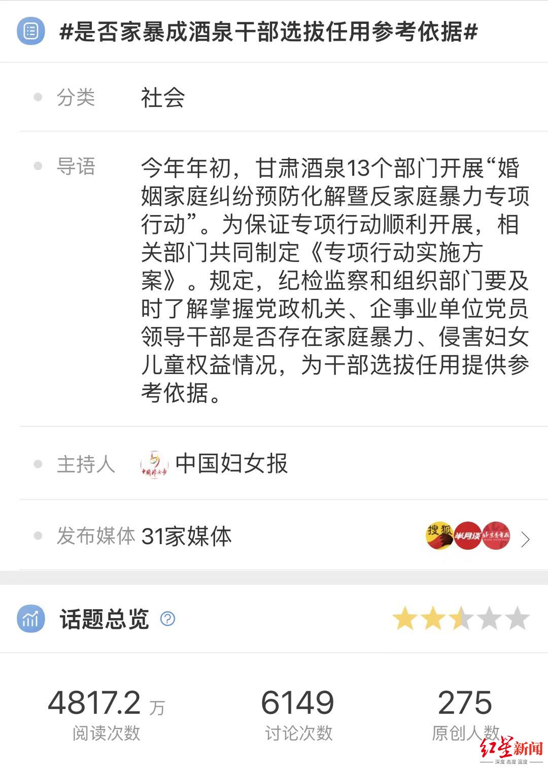 ↑近日,甘肃酒泉将“是否家暴”作为干部选拔任用参考依据的消息引发关注