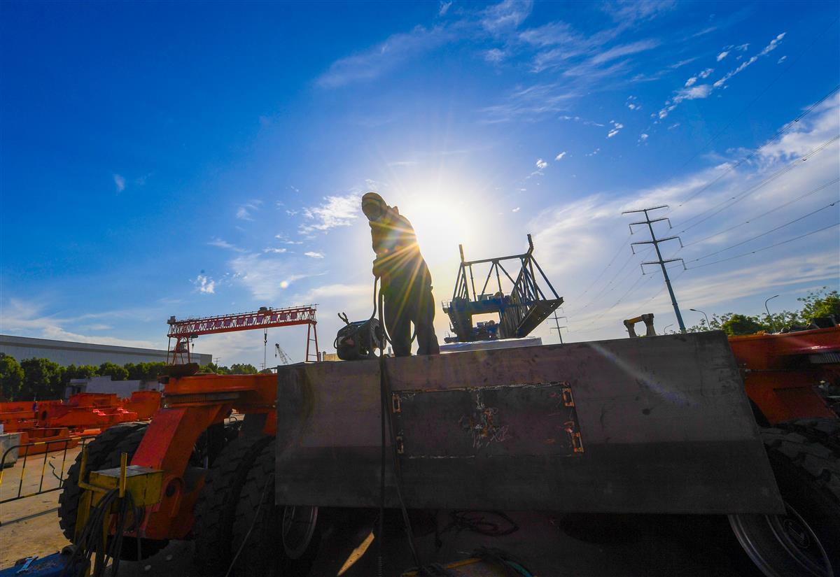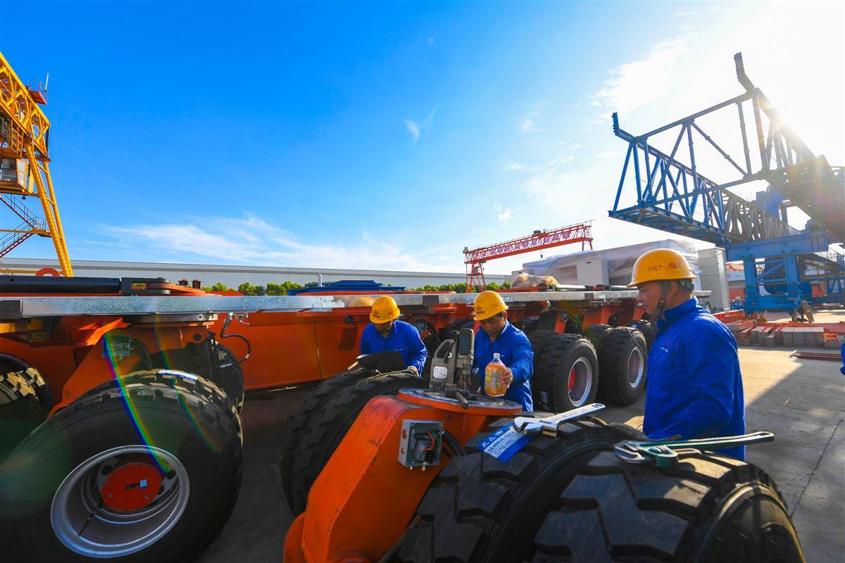 9月6日,中铁十一局汉江重工(襄阳)技术人员对全新千吨级运梁车进行最后调试。该款高铁运梁车由该局自主研发制造,经三次迭代升级,车身重量比上一代“瘦身”近200吨但运输能力不减,为生产企业节约制造成本,车辆使用效率也大为增加。据了解,这辆运梁车即将运至福建龙龙高铁施工现场使用。 (湖北日报全媒记者 田悦 通讯员 谢勇 张沛 摄)