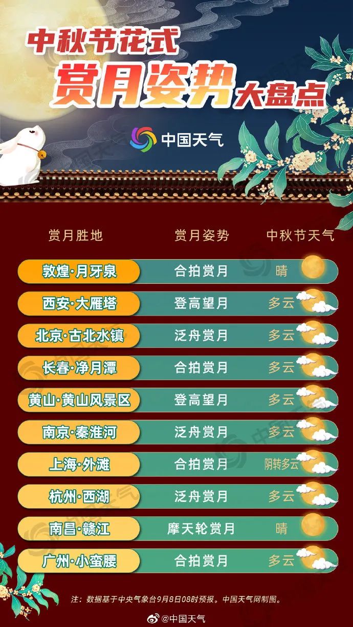 苏皖南部、上海等地都将是多云或阴天,上演“彩云追月”,圆月时而冒头时而隐身,在云朵映衬下增添一份神秘感。