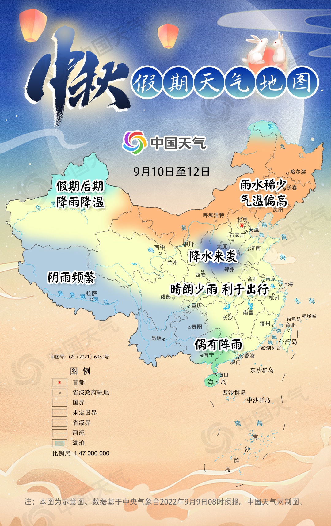 总体来说,今年中秋假期,我国中东部大部地区以及新疆南部、西北地区大部等地会延续晴朗少雨的天气格局,降雨将主要出现在西南地区大部、华南部分地区以及华北西南部到黄淮西部等地。