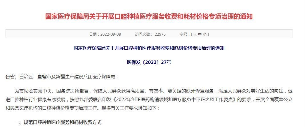 9月8日,《国家医疗保障局关于开展口腔种植医疗服务收费和耗材价格专项治理的通知》正式公布,百姓“种牙贵”难题有望破解。《通知》明确,口腔种植体将进行集采,牙冠进行竞价挂网,种植牙医疗服务进行价格调控,例如,三级公立医院医疗服务价格全流程调控目标为一颗牙4500元。