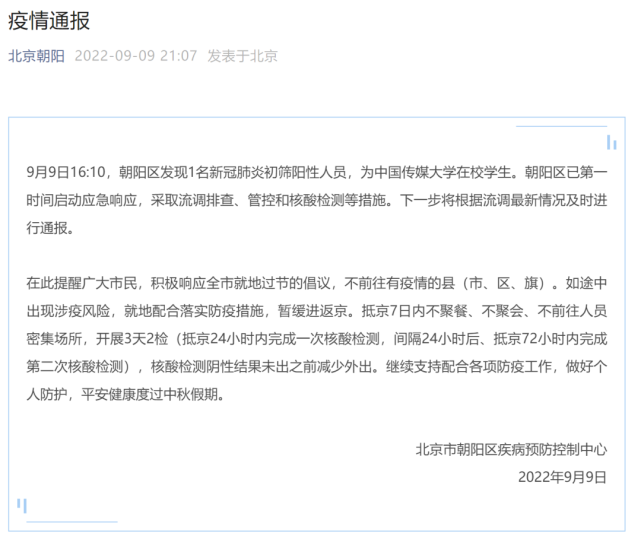 北京市朝阳区疾病预防控制中心昨晚发布通报,9月9日16:10,朝阳区发现1名新冠肺炎初筛阳性人员,为中国传媒大学在校学生。朝阳区已第一时间启动应急响应,采取流调排查、管控和核酸检测等措施。下一步将根据流调最新情况及时进行通报。