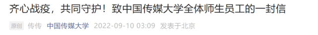 今天凌晨3点多,中国传媒大学通过官微发布《齐心战疫,共同守护!致中国传媒大学全体师生员工的一封信》称,9月9日,学校接到北京市朝阳区疾控中心信息,告知有1例新冠肺炎疑似阳性病例系中国传媒大学在校学生。学校高度重视,快字当头,立即启动应急预案,自17时起对校园实行应急封闭管理,坚决阻断病毒传播,守护广大师生的平安健康。