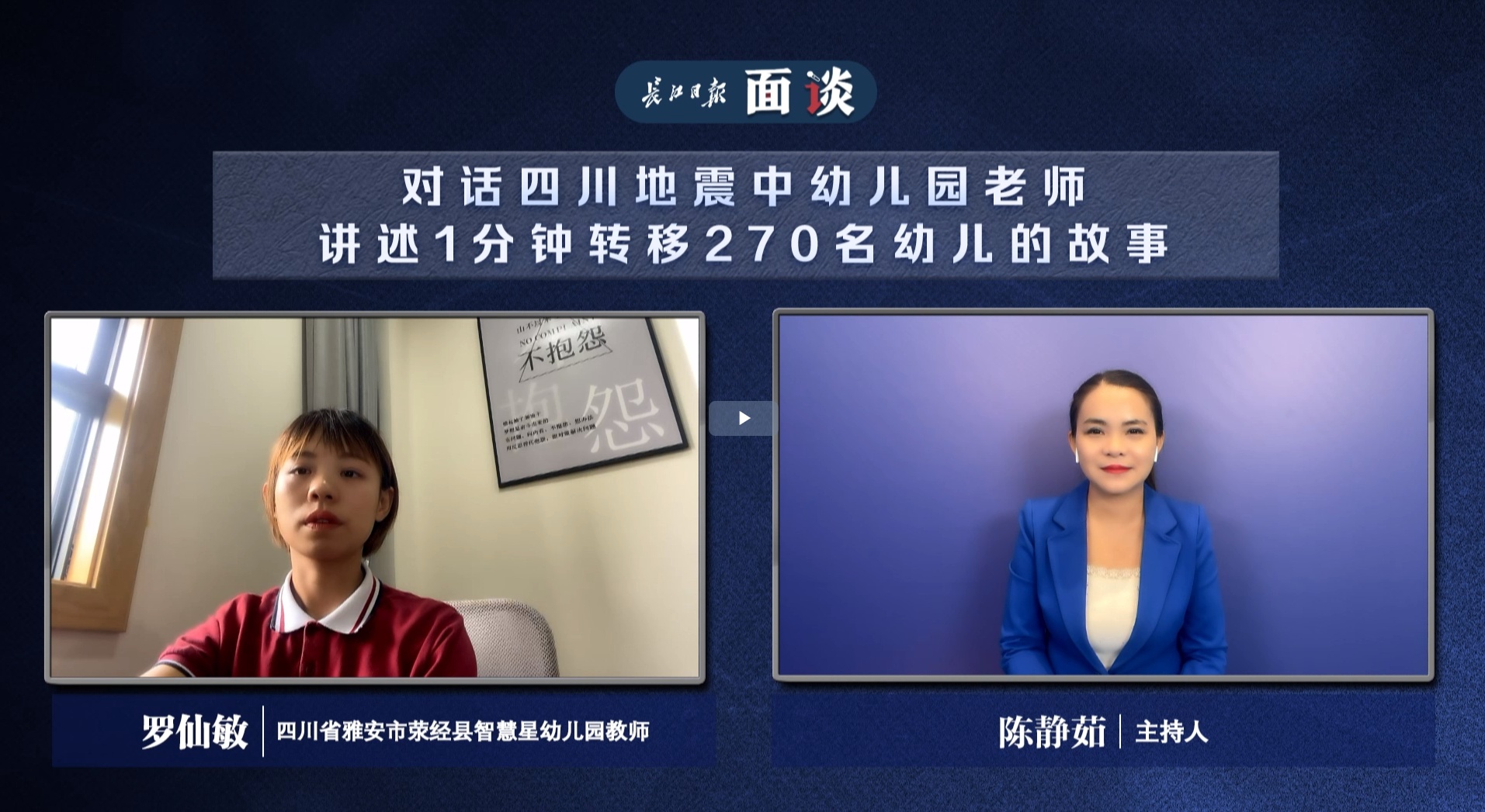 长江日报大武汉客户端9月10日讯(记者陈静茹)9月5日,四川省甘孜州泸定县发生6.8级地震,多地震感强烈。地震发生时,在毗邻震中的雅安市荥经县智慧星幼儿园,老师刚安顿好孩子们午睡,到位于幼儿园一楼的食堂吃饭。感受到地震的一瞬间,他们奔回教室,迅速将全园270名幼儿全部安全转移。9月9日,他们中的罗仙敏老师走进《面谈》,讲述背后的故事。本期《面谈》节目在网络中吸引众多网友关注,各平台观看视频网友达32万。