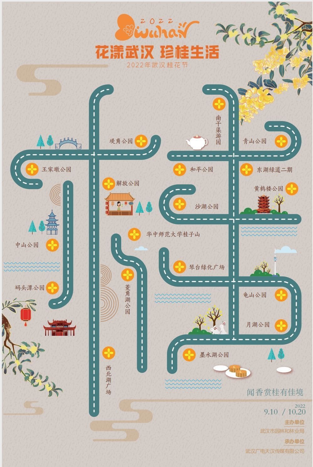 金秋时节,桂香满江城,近百万株桂花树覆盖了武汉的山林、湖畔、公园和道路。为了让市民观赏到最美桂景,主办方从武汉三镇近百处赏桂景点中,挑选18处最具代表性、人文性的桂花观赏点,绘制出“闻香赏桂18景”地图,将于开幕当天线上发布。