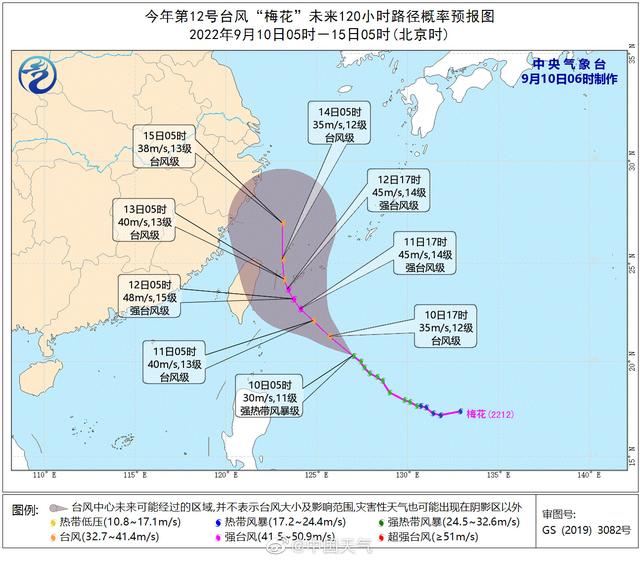 预计,“梅花”将以每小时15-20公里的速度向西北方向移动,强度逐渐增强,最强可达台风级或强台风级(40-45米/秒,13-14级),并向琉球群岛南部海域靠近。