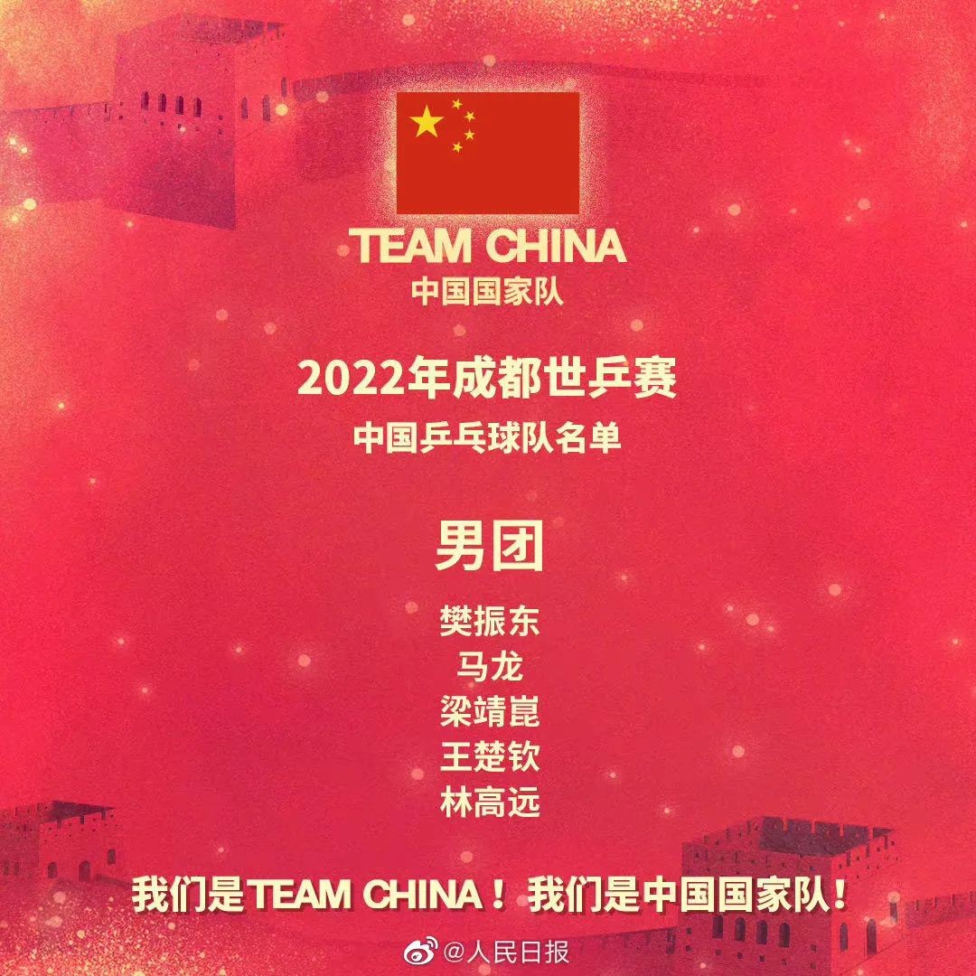 9月11日,国乒世乒赛战队名单正式出炉,男队为樊振东、马龙、王楚钦、梁靖崑、林高远。女队为孙颖莎、陈梦、王曼昱、王艺迪、陈幸同。
