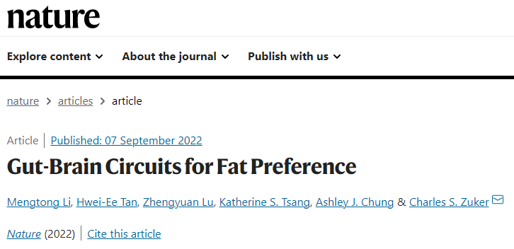 2022年9月,美国哥伦比亚大学、霍华德休斯医学院的研究人员在《Nature 》(《自然》)期刊上发表了一篇题为“ Gut-Brain Circuits for Fat Preference ”的研究论文。