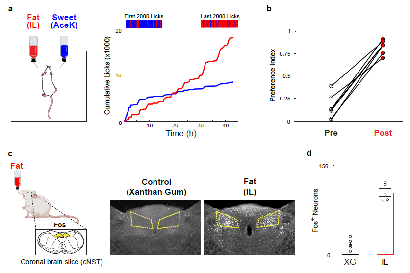 在喂食小鼠脂肪的同时,研究人员测量了小鼠的大脑活动,发现脑干区的孤束尾核(cNST)神经元表现活跃。