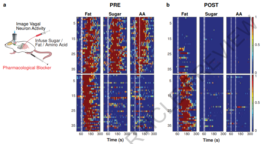 当研究人员使用药物阻断任意一条通路时,发现都可以阻止迷走神经元对肠道中的脂肪做出反应,进而消除大脑对脂肪的偏好。