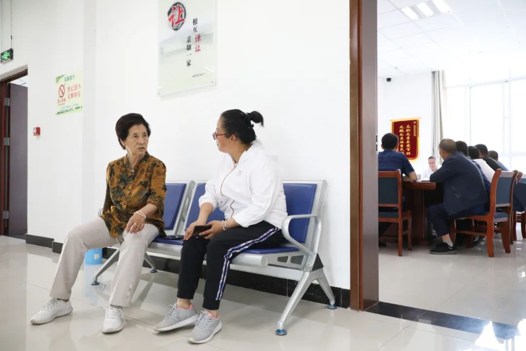 6月30日下午,在甘肃省定西市陇西县综治中心综合调解室外,工作人员陪同王毓花(左)等待商议结果