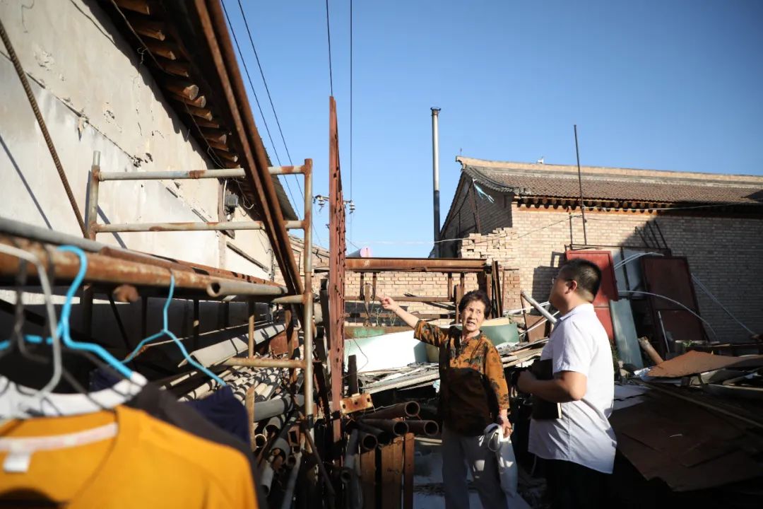 6月30日下午,在甘肃省定西市陇西县,乡镇工作人员(右)查看王毓花的老屋裂缝情况