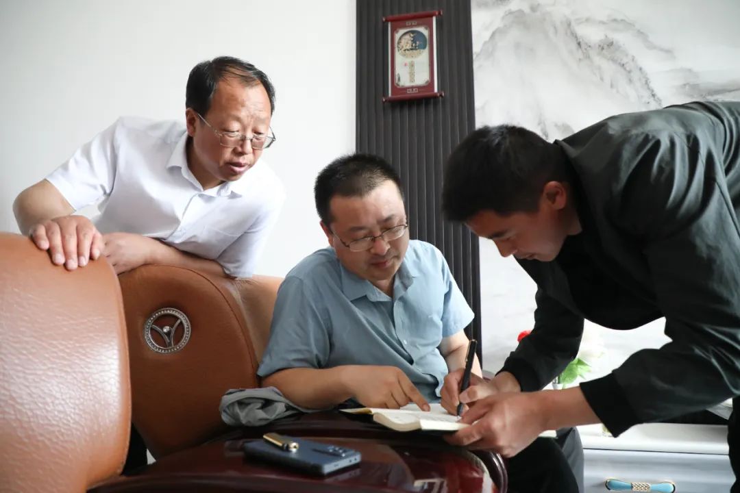 7月1日早上,在甘肃省定西市陇西县王毓花的家里,施工方代表(右二)与王毓花(左二)签署协议书
