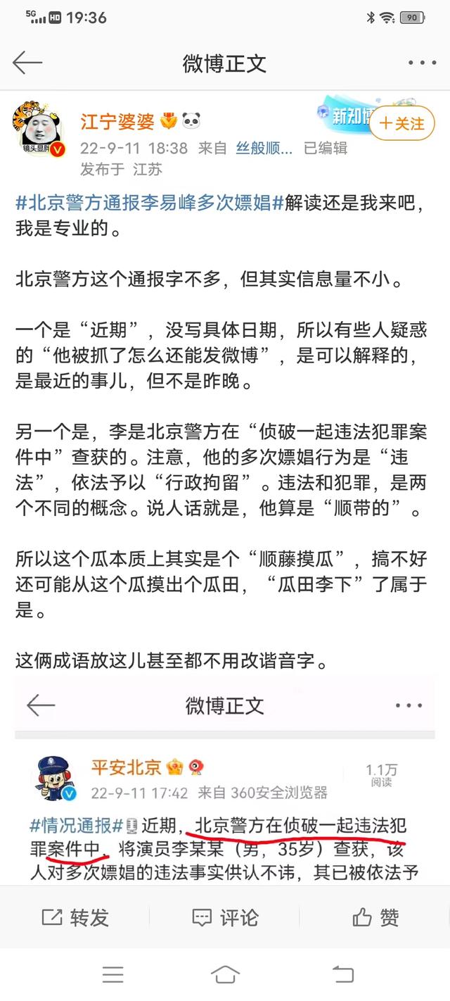 9月11日18:38,微博大V江宁婆婆发布微博,从法律的角度解读李易峰嫖娼被行拘案。