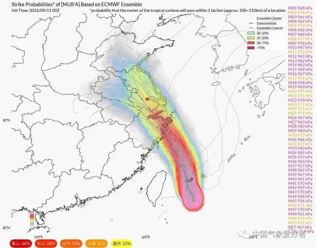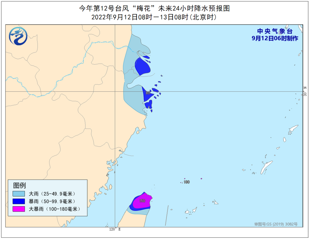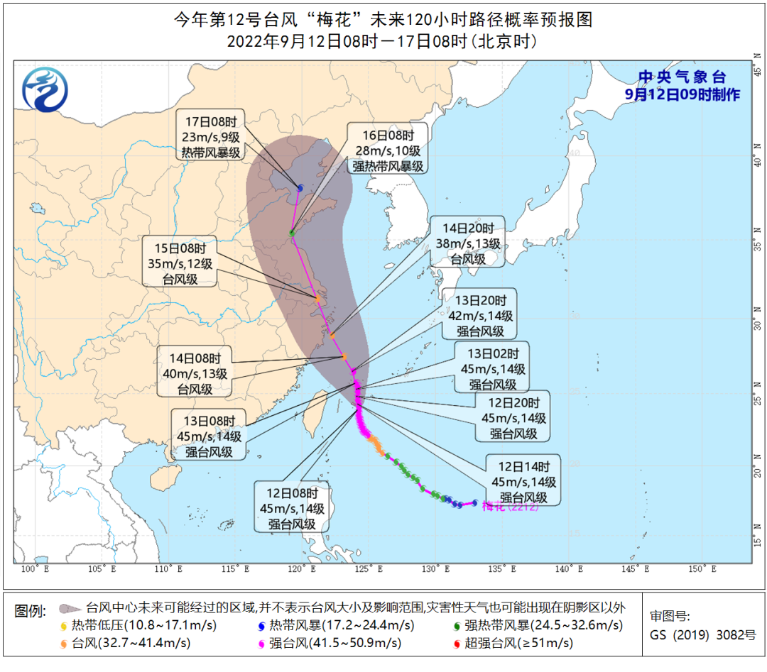 梅花最大可能是9月14日夜间到9月15日白天在浙江中北部登陆,随后穿过江浙沪陆地,但也有可能在9月15日紧擦舟山上海和江苏沿海北上。