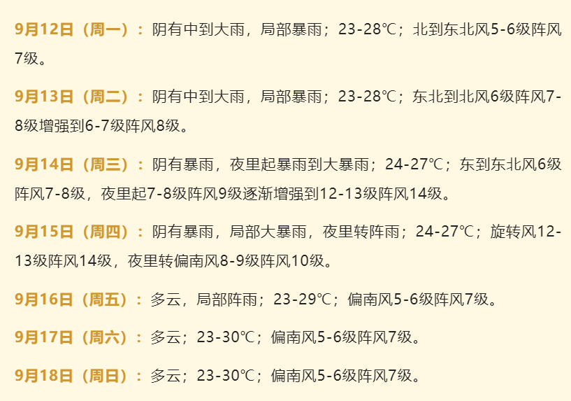 浙江省海洋监测预报中心预计,9月13日至15日,我省沿岸将出现一次台风风暴潮过程和一次大风浪过程,其中风浪最大出现在14日至15日,我省海域将出现8.0米至10.0米的狂浪到狂涛。