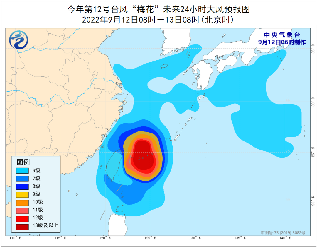 今年第12号台风“梅花”(强台风级),今天(12日)10时中心位于距离浙江省舟山市南偏东方向约670公里的洋面上,就是北纬24.2度、东经124.2度,中心最大风力14级(45米/秒),950百帕。
